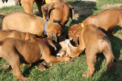 Im wilden Rudel gibt die Mutter nach der 8. Woche die Erziehung in die "Hände" des Vaters. Da dieser nicht da ist hat mir Fanny diese Aufgabe übergeben. Sie hat sich fast völlig zurückgezogen und hat mich, wenn es Rangeleien unter den Welpen gab, angesehen als wollte sie sagen "los, tu deinen Job!" :-)))