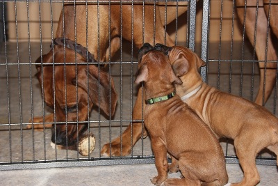 Wenn sie wach sind ist Chuma immer am Welpengehege und schaut ihnen zu oder schmust durch Gitter mit ihnen. Zu den Kleinen lassen will ich ihn noch nicht, er spielt bestimmt viel zu wüst mit ihnen. Dafür sollen sie noch etwas wachsen!